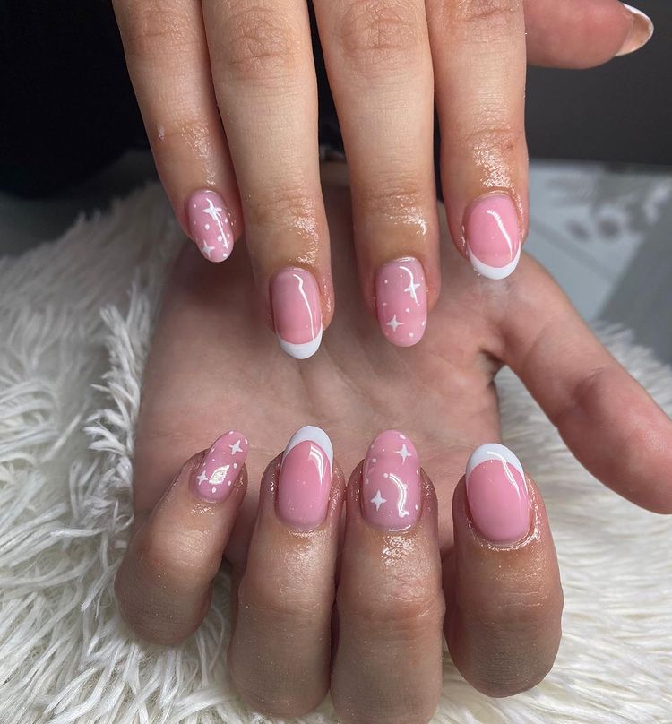 White-French-Round-Nails-With-Stars-and-Dots