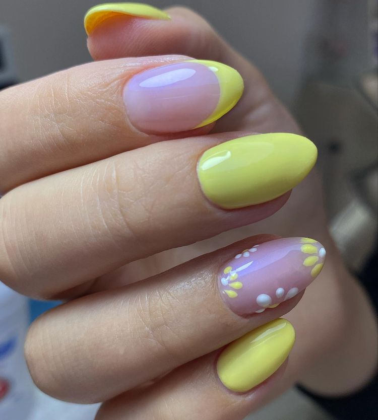 Yellow-French-Almond-Nails-With-Daisies